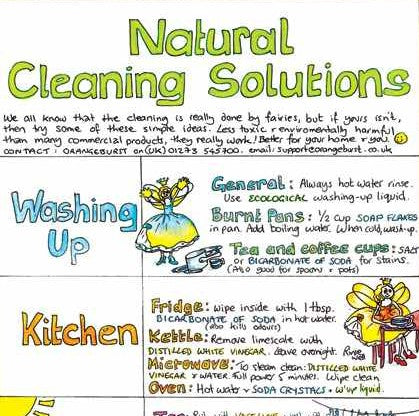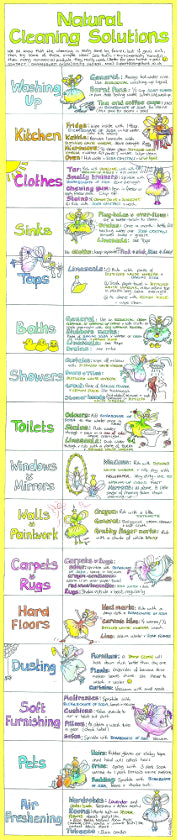 We all know the cleaning is really done by fairies (especially the one that does that black ring around the bath). But if your house seems to need a little human intervention then this chart is the guide to environmentally friendly approaches to cleaning - using less toxic and often much less packaged and expensive alternatives to commercial cleaning products.