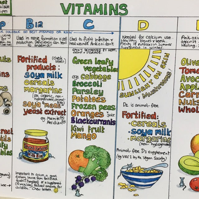 You may well have seen this Nutrition chart on a kitchen wall somewhere in the world as there are nearly 200,000 of them out there somewhere - literally all over the globe! Drawn as a quick reference guide for bringing up her son on an plant based diet, the original chart has been going strong since 1992, during which time it has been regularly redrawn and updated by Liz as the latest nutritional research has come to light.