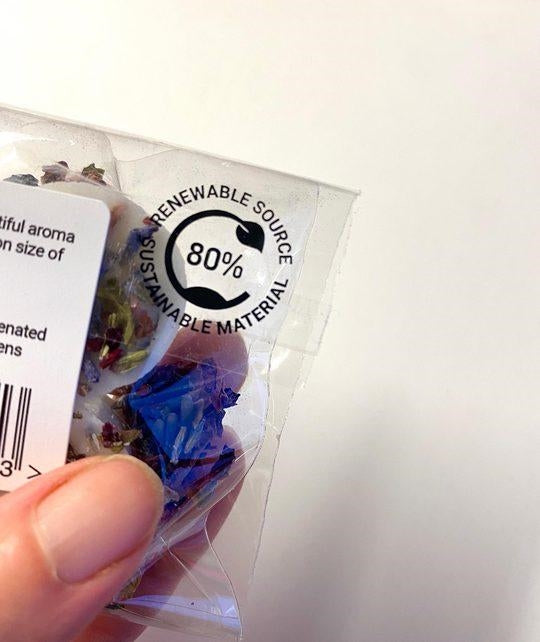 The melts are sprinkled with dried flower petals and wrapped in a biodegradable corn starch wrapper.