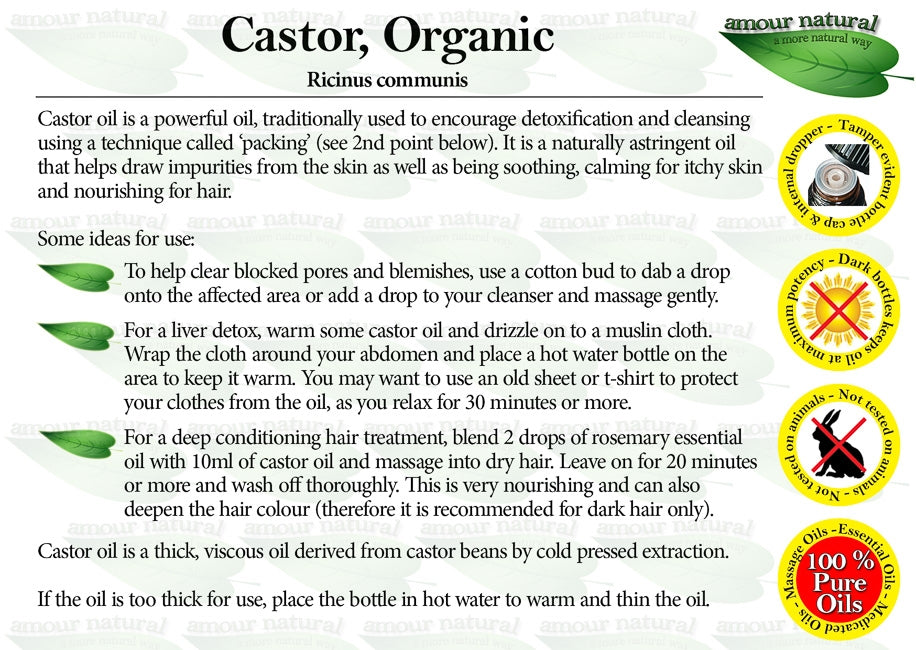 Castor oil is derived from castor beans by cold-pressed extraction. If the oil is too thick for use, place the bottle in hot water to gently warm the oil.