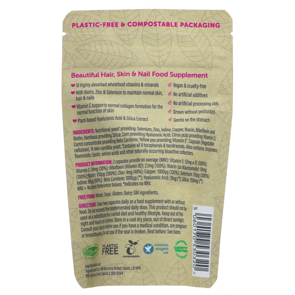 Together Health have created an inner beauty supplement to make you look and feel that little bit extra special. Along with all the benefits of our much-loved WholeVit, food-based range we've carefully selected a combination of natural glow-giving nutrients to enrich your hair skin and nails. Using whole food ingredients we create vitamins that are easily absorbed and gentle on the stomach. Our formulation of unique collagen is protein rich and complete with essential co-factors that carry nutrients to where they're needed most in the skin. We also include natural silica from bamboo extract (which is incidentally the richest known natural source). Key highlights: ,Specially targeted to support hair skin and nail health ,Collagen combined in yeast extract ,Natural silica from bamboo extract ,Complete nutrients with powerful natural food compounds ,Effective yet gentle on the stomach ,Highly absorbed retained and utilised ,Free from additives and processing chemicals ,Raw ingredients ,Non GMO ,Free from pesticides and herbicides ,Handy resealable pouch ,Made in the UK ,Vegan
